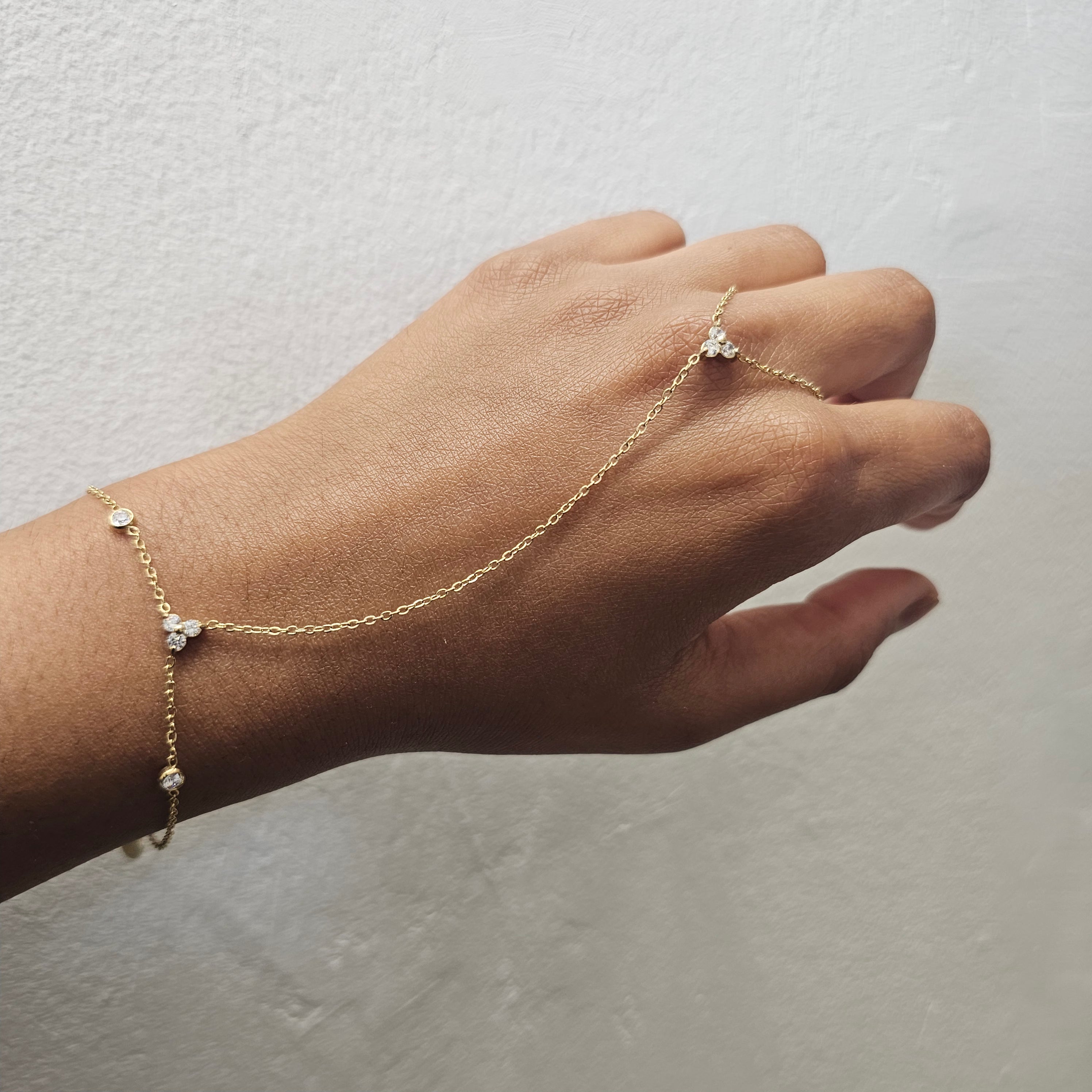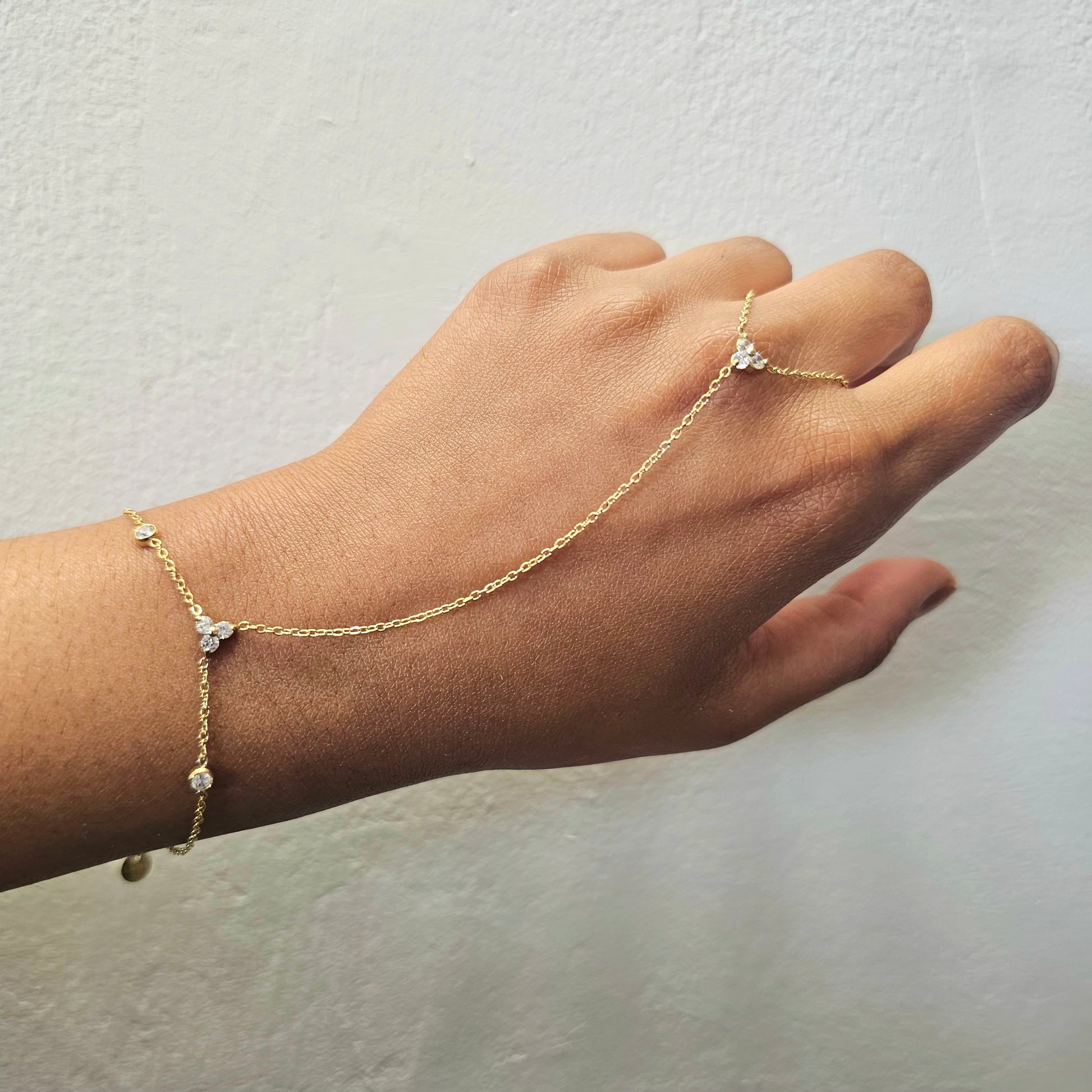 This elegant handchain has a clover near the fingers, and another clover desgin on the wrist. It also has 2 circular gems on both sides of the wrist. It makes for a great fancy handchain to bring about the sparkle!