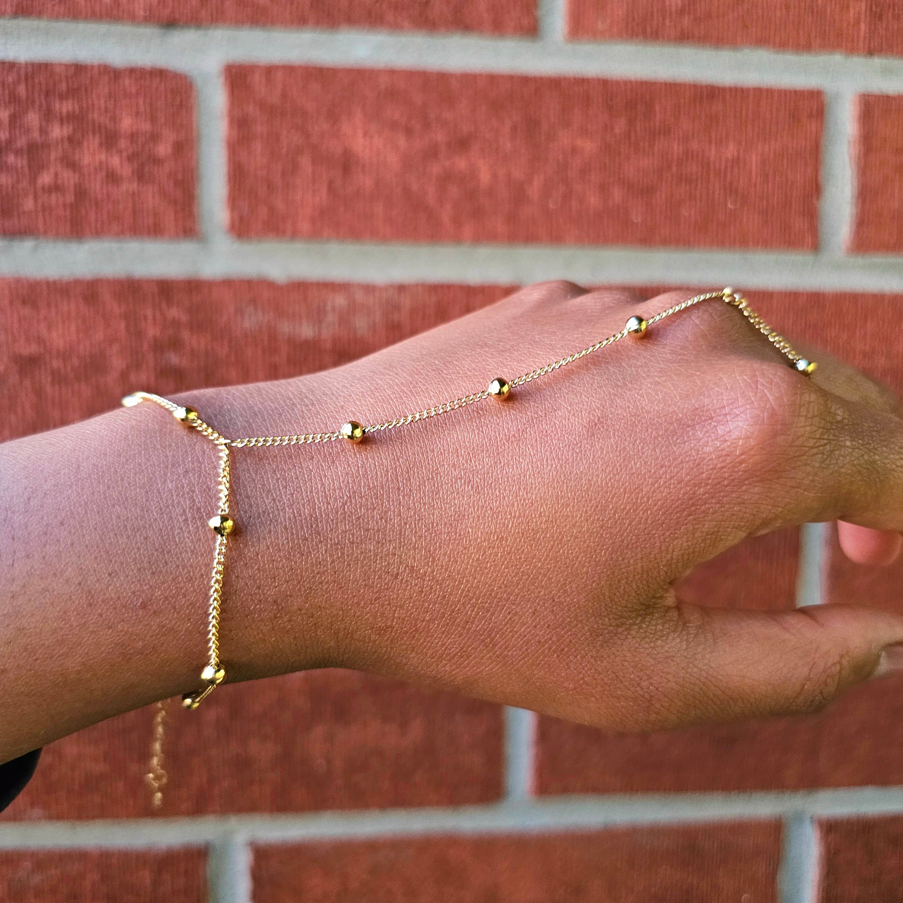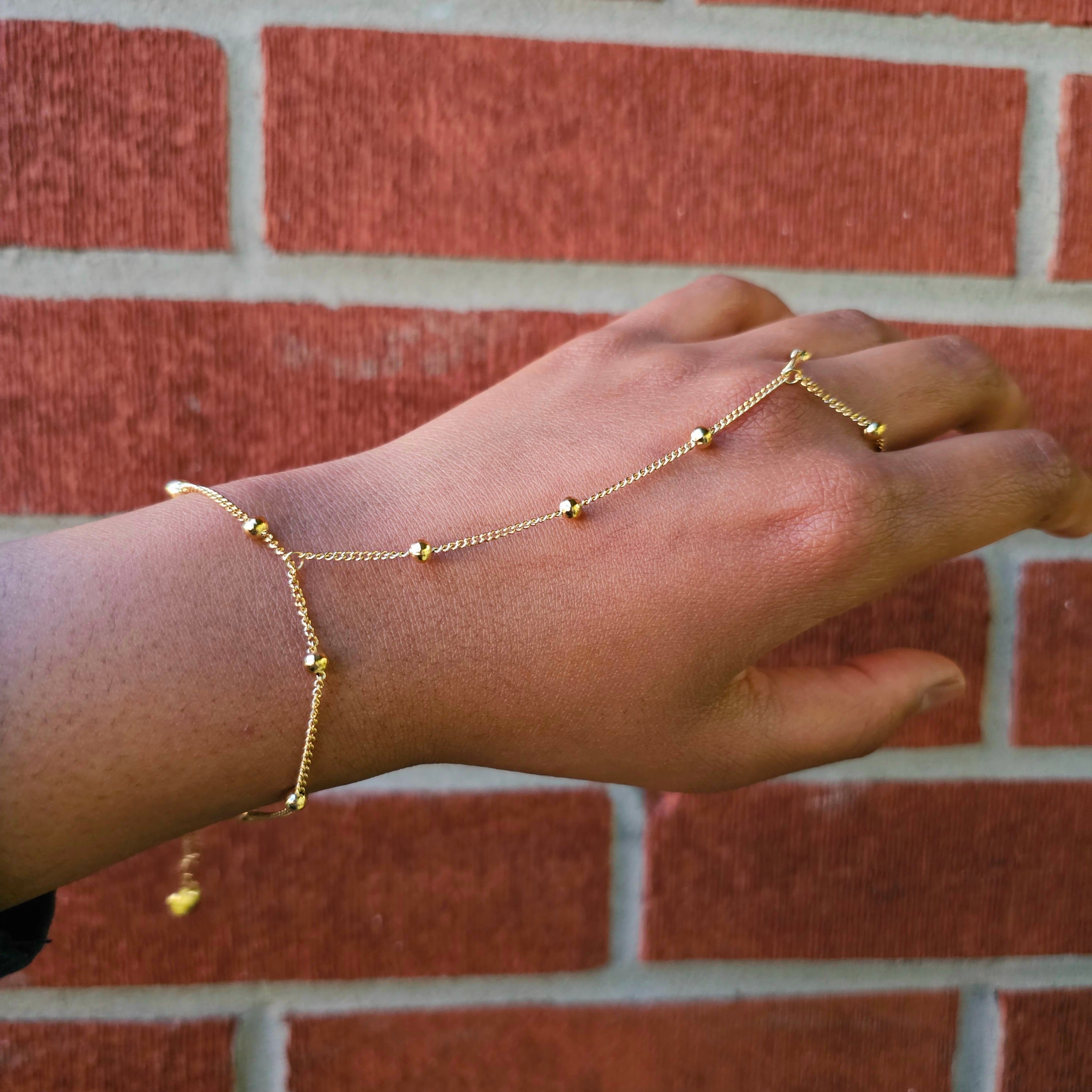 This elegant hand chain features bold gold-toned dots, evenly spaced for a clean and classic look. Crafted to add a traditional yet stylish touch to your outfit, it wraps gracefully around the wrist and finger. Perfect for special occasions or everyday wear, this piece combines simplicity with charm.