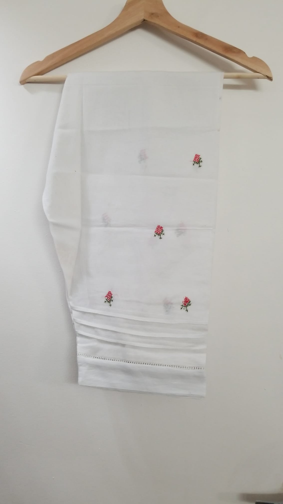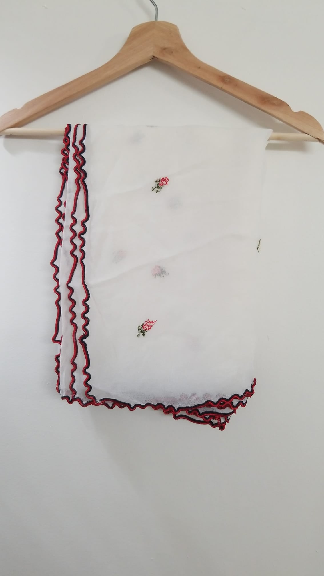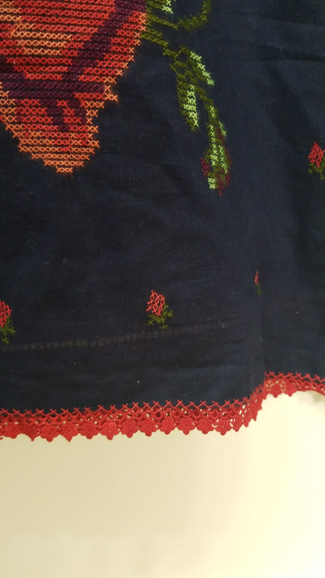 This is a beautiful navy blue suit with floral red and green embroidery. It is paired with a white shalwar with embroidered details, and a white chiffon dupatta with embroidery and hemming on all sides.