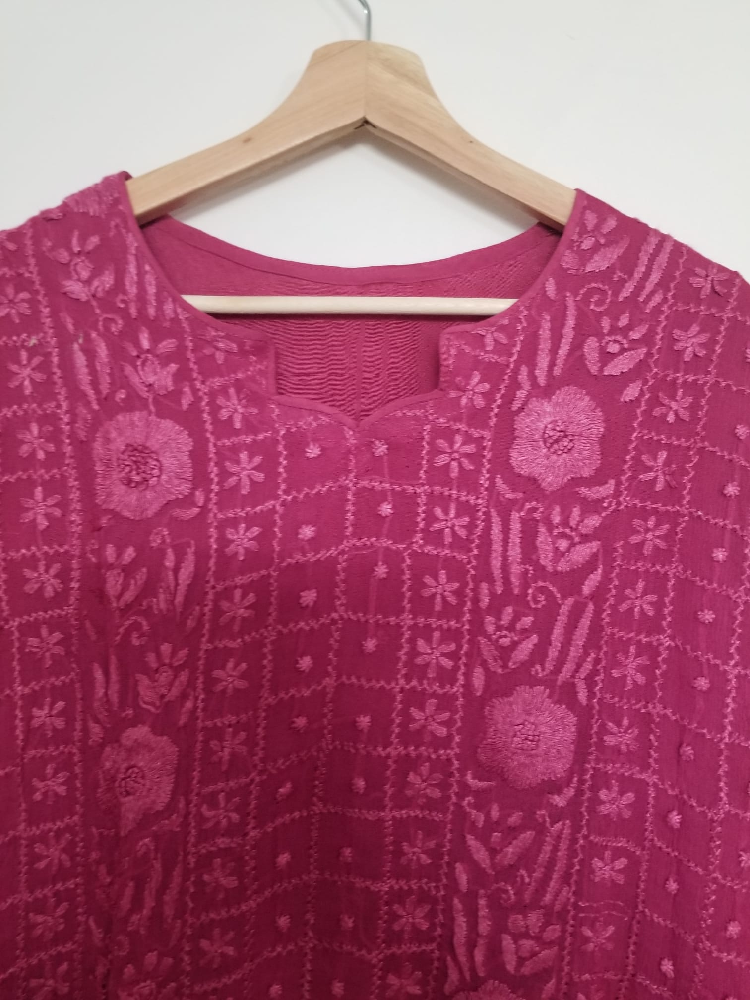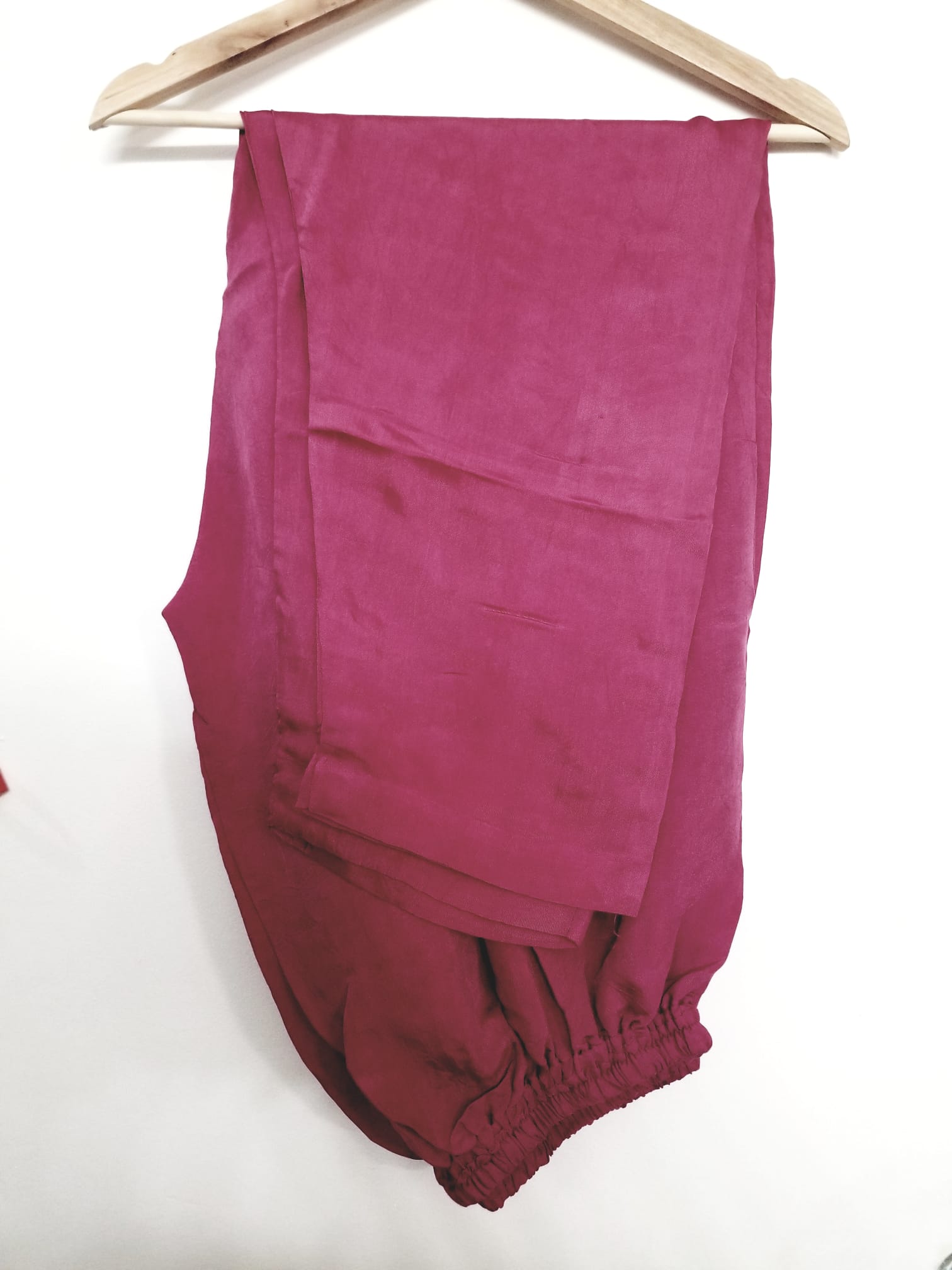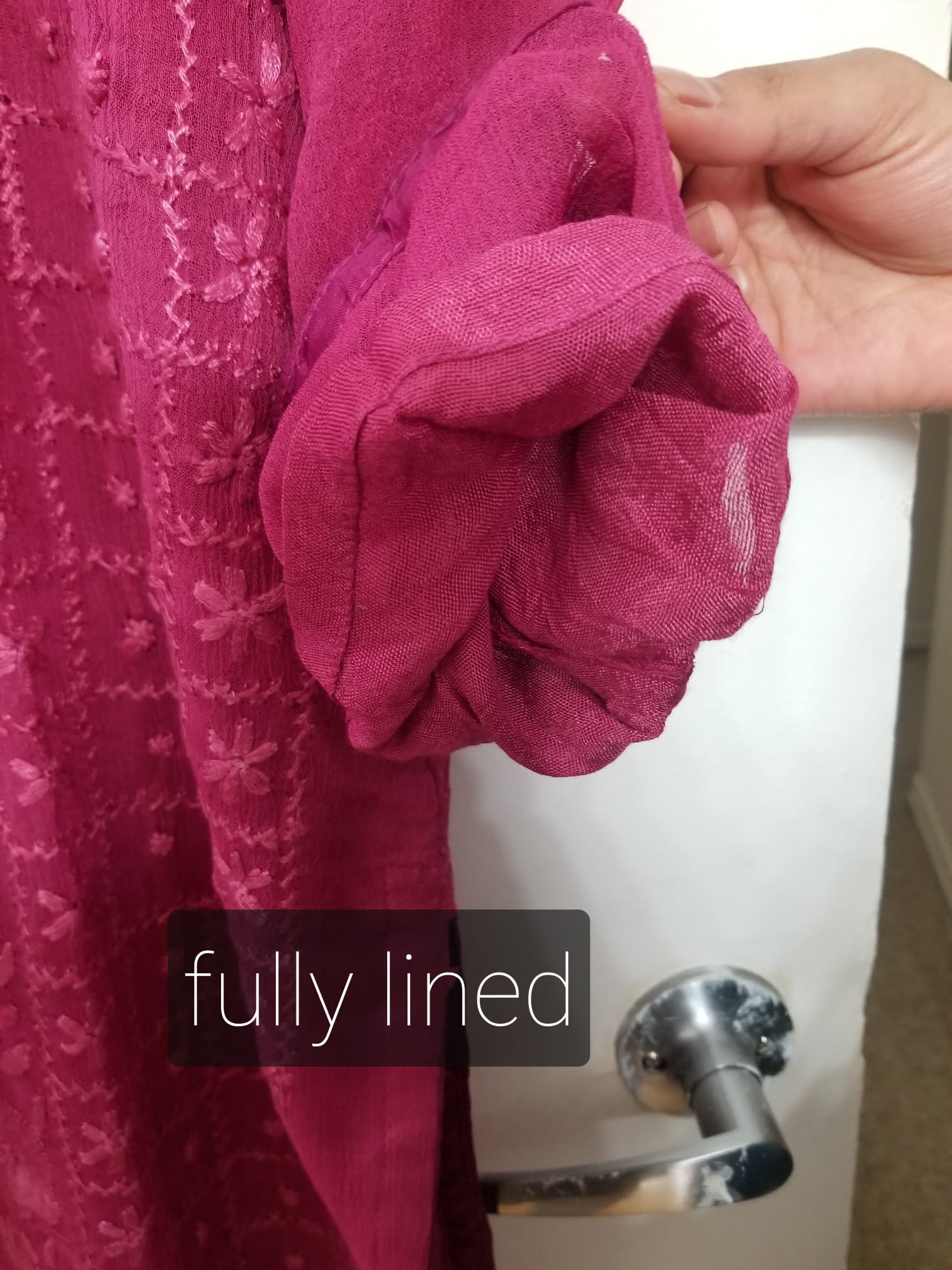 This beautiful Dusty Magenta Color Chiffon Suit is a 3 piece set. It is elegantly hand embroidered, and fully lined on the entire arms and body with a very soft material. The dupatta is also hand embroidered and made fully hemmed beautifully on all sides. The shalwar is made with a strong and soft viscose fabric, which makes it perfect for all seasons!