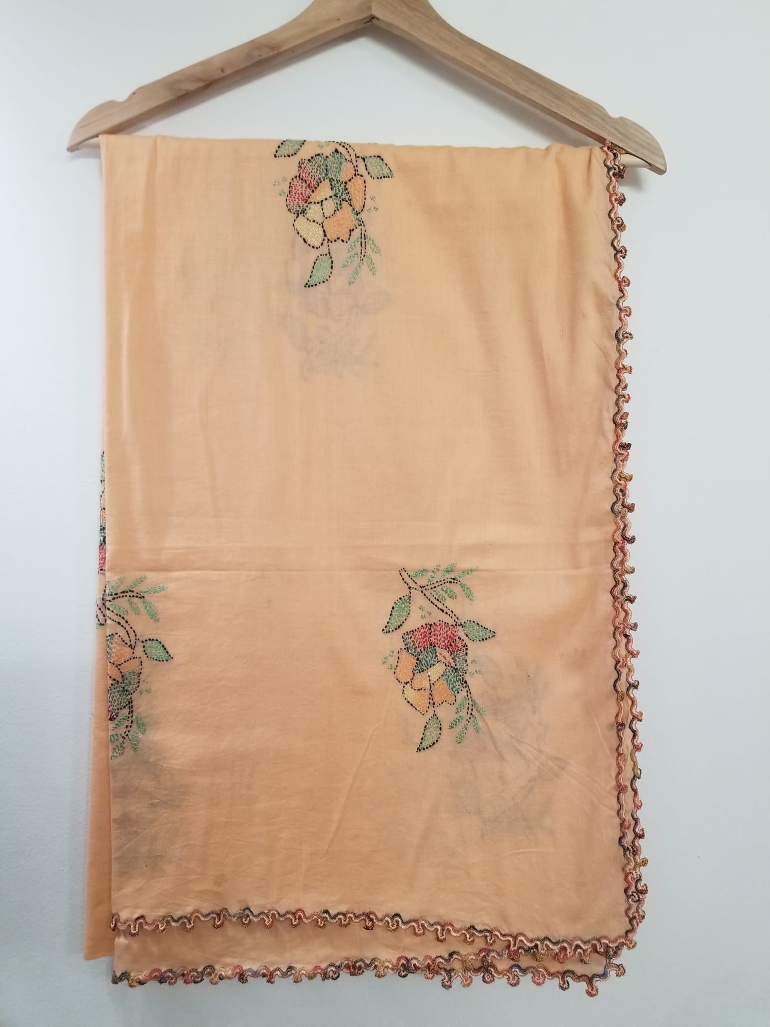 This light peach colour suit is beautifully hand embroidered with green and pink florals. It is fully piped, and with beautiful along the neckline.