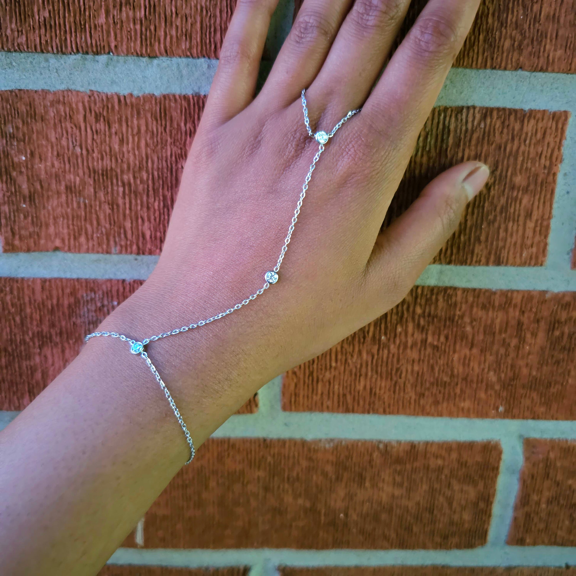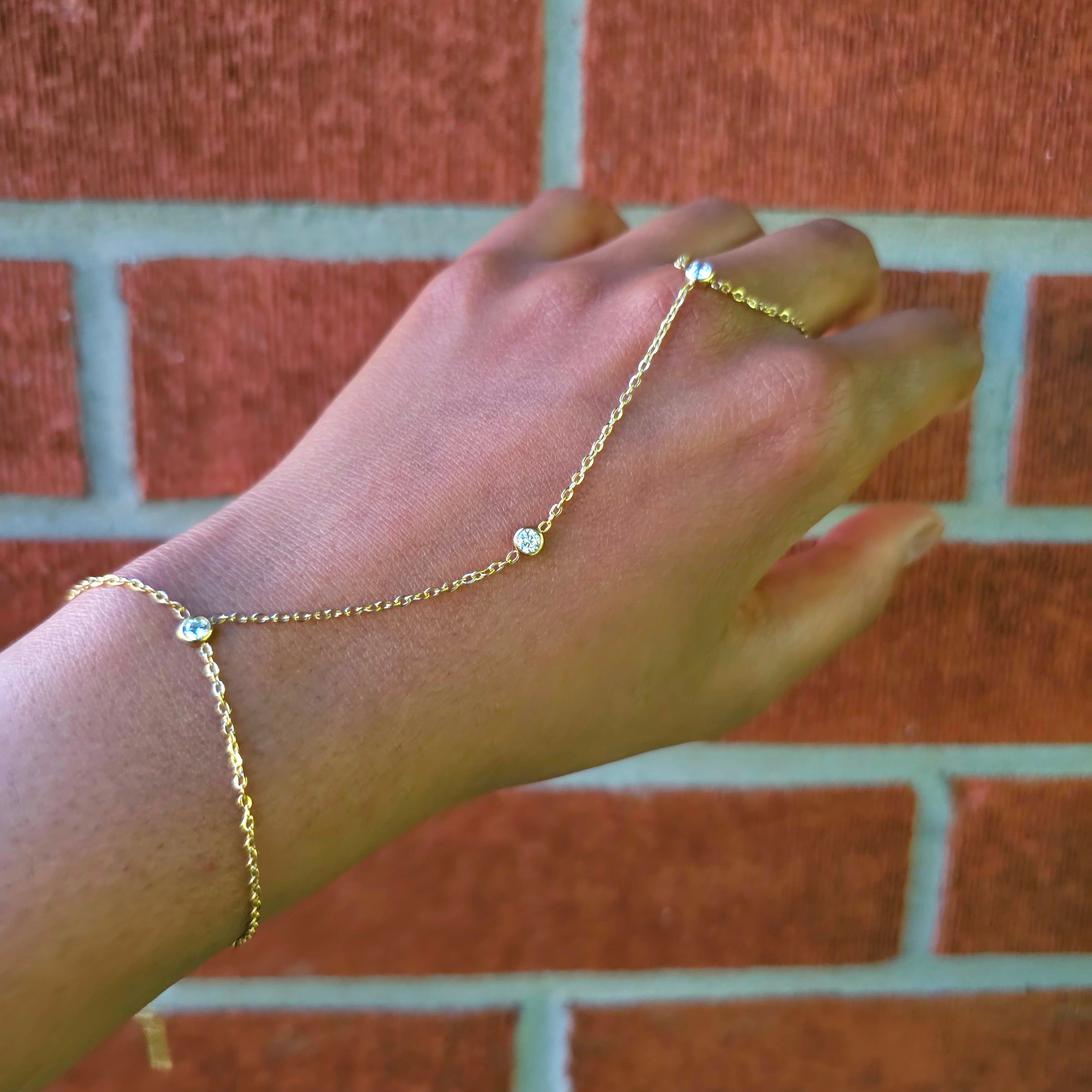 Delicate and graceful, this thin hand chain features three round-cut Zirconia gems, thoughtfully placed to highlight every part of your hand — from finger to wrist. A sparkling gem sits at the fingertip, one shines at the center, and the third rests elegantly on the wrist, connected by a fine gold-toned chain. This minimalist design adds a subtle sparkle, perfect for both everyday elegance and festive occasions.