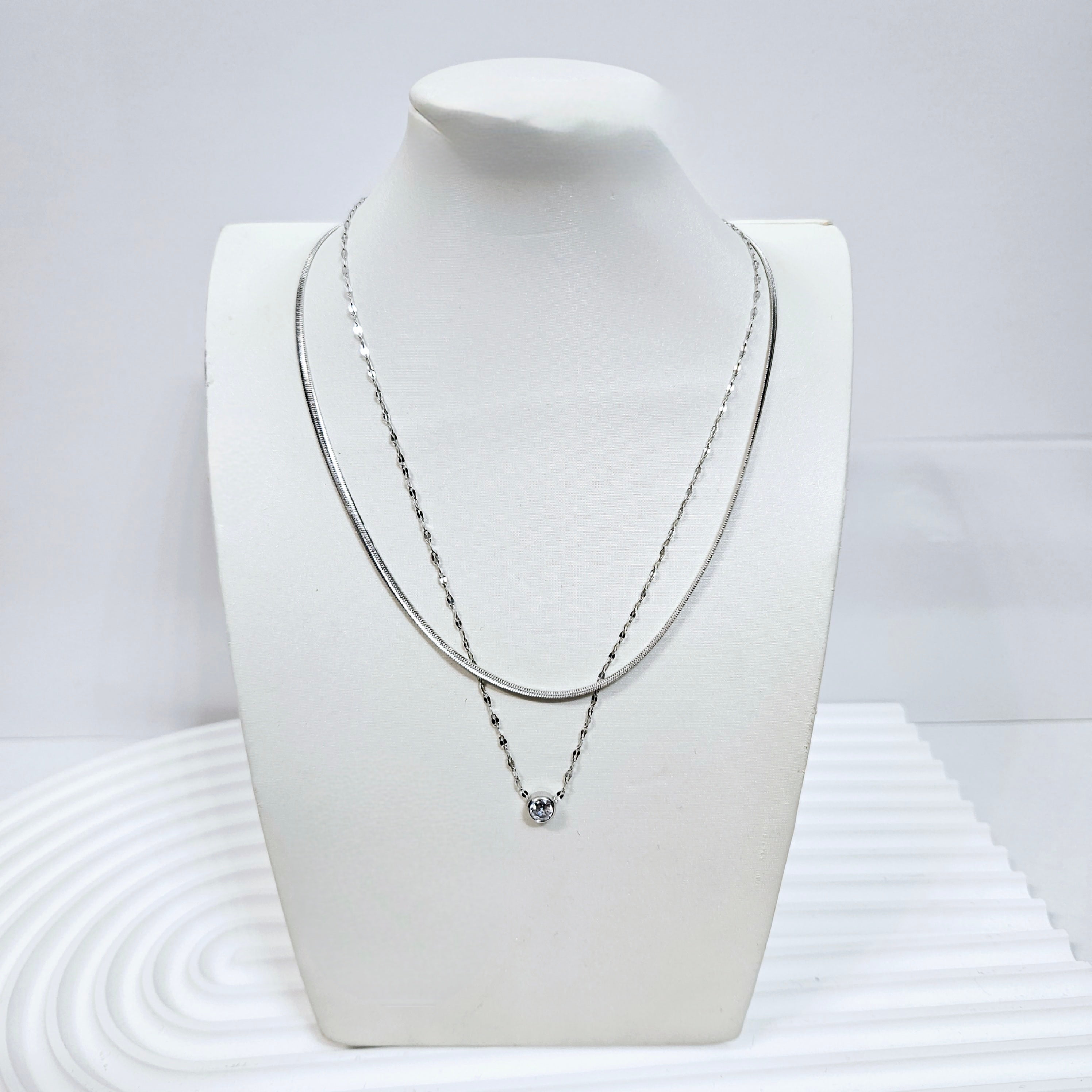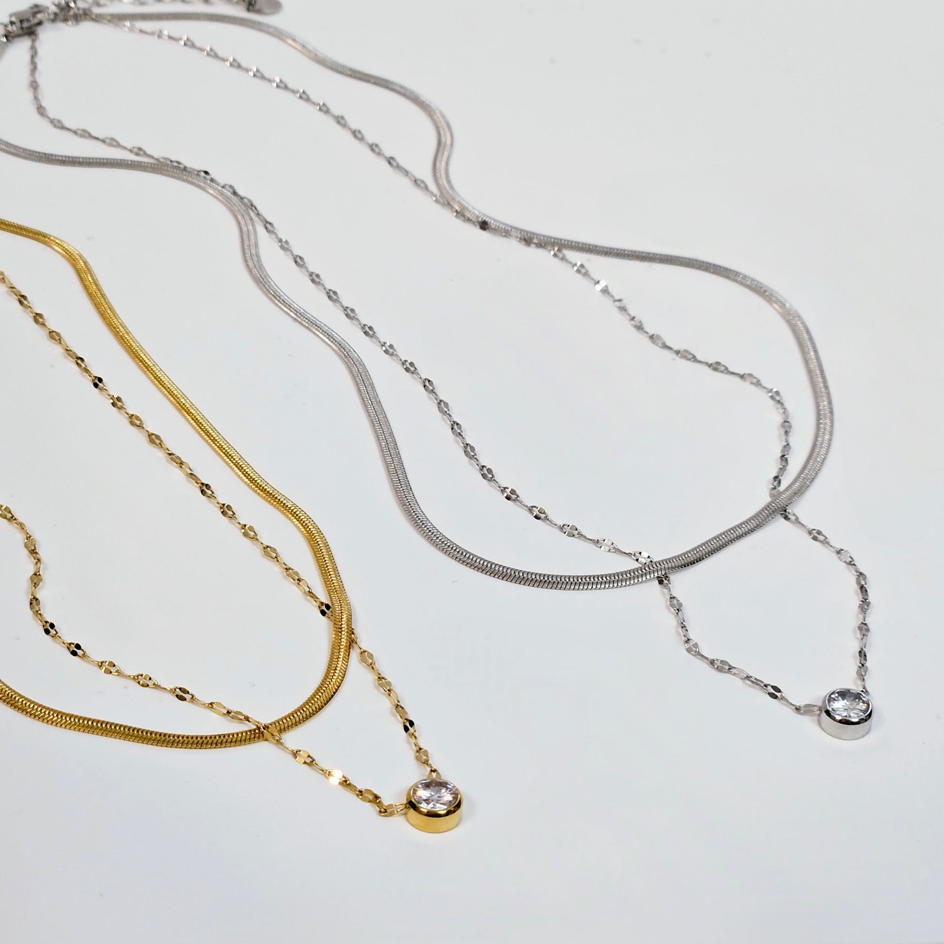 Double Layered Single Gem Necklace - Silver or Gold