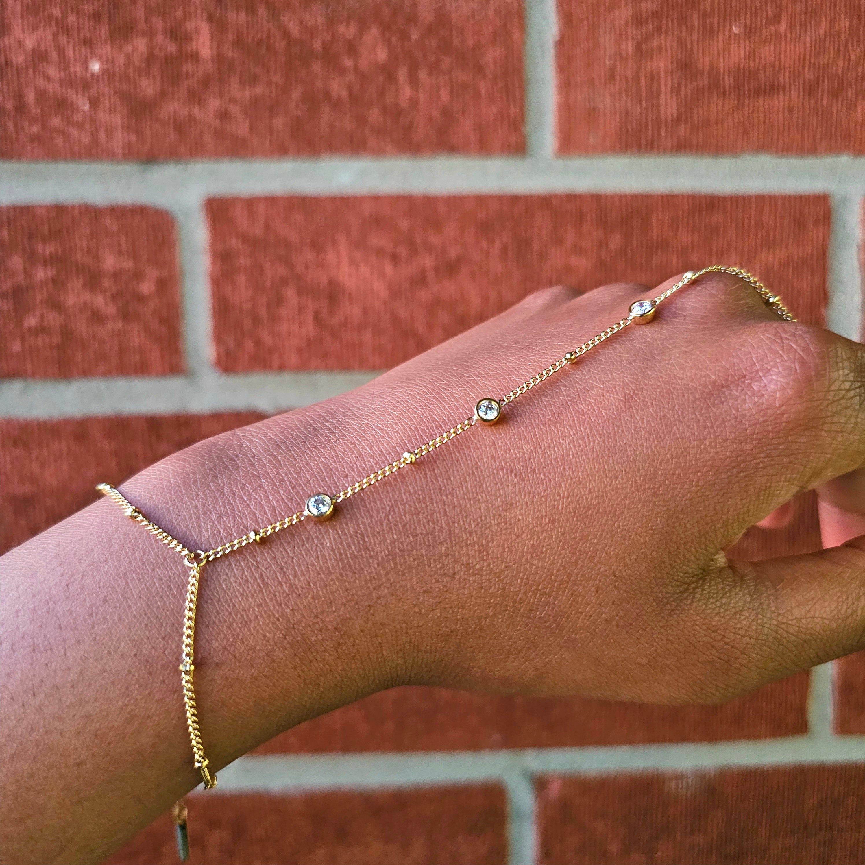 This elegant hand chain features 3 evenly spaced out circular Zirconia gems on a dainty classic dotted chain. It is a gread hand chain for elevating any look!